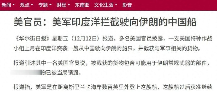 最近,一艘从中国前往伊朗的商船在印度洋被美国特种部队截停,此事不仅引来世界关注,而且令人察觉到大国间海上对抗愈来愈明显,这次拦截发生在公海之上,距离斯里兰卡海岸几百英里远,美国称船上存有大概同伊朗常规武器有关联的东西,在查看并销毁货物之后才让这艘船只继续前行,但背后有着更为复杂的目的与争论。